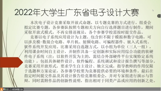 4月4日,在这清明假期时期,为提高大学生的创新能力与动手能力,促进同学们之间交流与合作能力,信息科学学院专门就“2022年广东省大学生电子设计大赛”开展线上会议讲座,本次讲座由许志明老师为主讲。