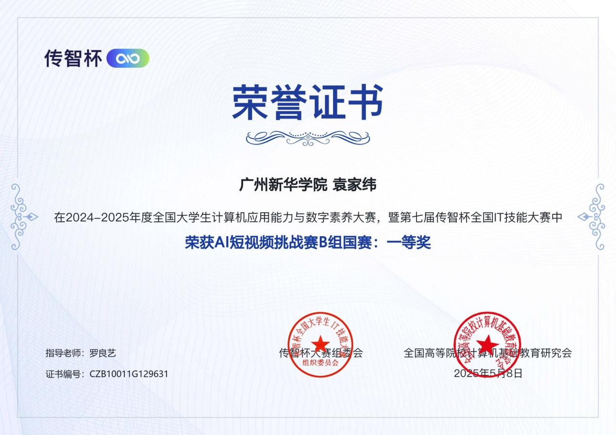 国家级奖项中,颜昭棋、李文欣、严胜南的团队凭借《基于AI+销售+溯源的农鲜直链平台》斩获Web网页开发挑战赛国赛一等奖(本科组第一名),袁家纬在AI短视频挑战赛中获国赛一等奖。