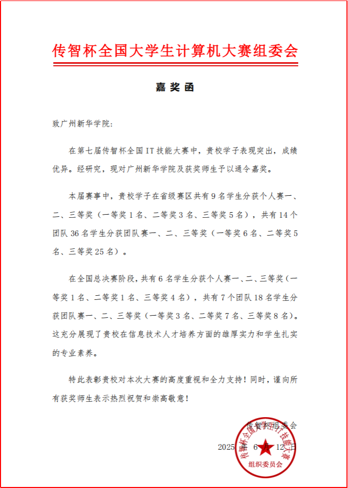 竞赛组委会在嘉奖函中特别指出:永利yl23411学子以扎实的专业素养和创新精神,在大赛中屡创佳绩,充分彰显了学院在信息技术人才培养领域的深厚底蕴。组委会同时对学院的组织工作给予肯定,并勉励获奖师生再接再厉。