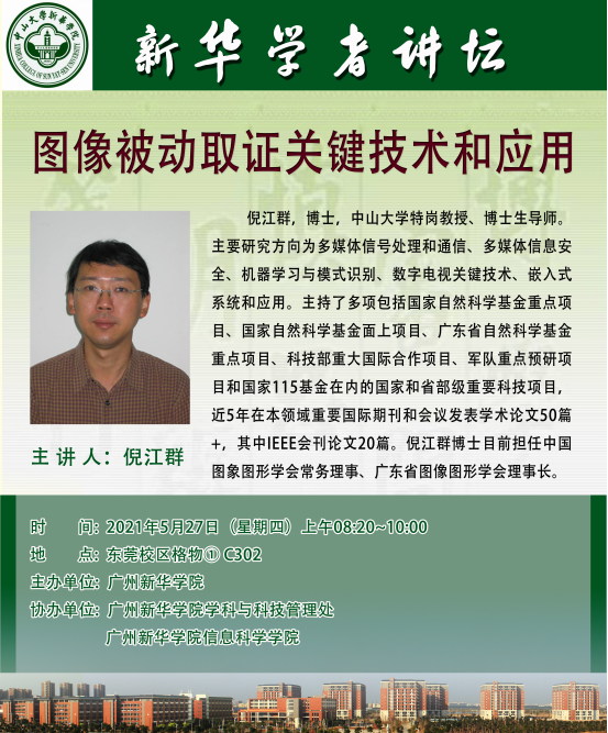 倪江群,博士,中山大学特岗教授、博士生导师。主要研究方向为多媒体信号处理和通信、多媒体信息安全、机器学习与模式识别、数字电视关键技术、嵌入式系统和应用。主持了多项包括国家自然科学基金重点项目、国家自然科学基金面上项目、广东省自然科学基金重点项目、科技部重大国际合作项目、军队重点预研项目和国家115基金在内的国家和省部级重要科技项目,近5年在本领域重要国际期刊和会议发表学术论文50篇+,其中IEEE会刊论文20篇。倪江群博士目前担任中国图象图形学会常务理事、广东省图像图形学会理事长。