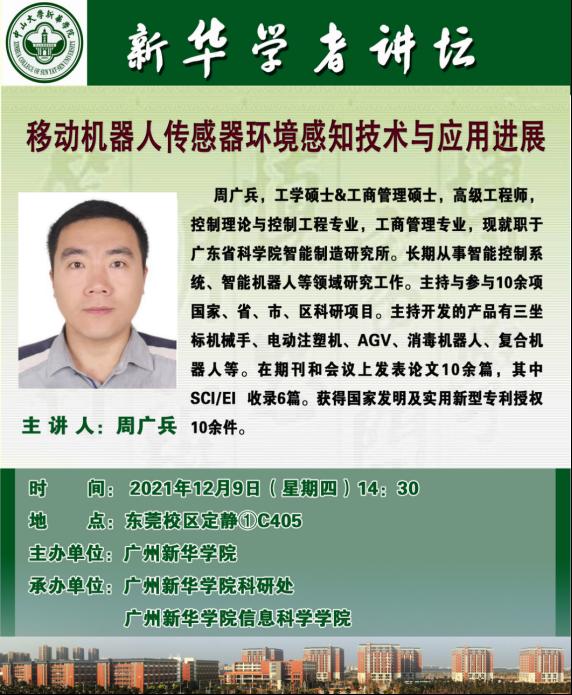 周广兵,工学硕士&工商管理硕士,高级工程师,控制理论与控制工程专业,工商管理专业,现就职于广东省科学院智能制造研究所。长期从事智能控制系统、智能机器人等领域研究工作。主持与参与10余项国家、省、市、区科研项目。主持开发的产品有三坐标机械手、电动注塑机、AGV、消毒机器人、复合机器人等。在期刊和会议上发表论文10余篇,其中SCI/EI 收录6篇。获得国家发明及实用新型专利授权10余件。