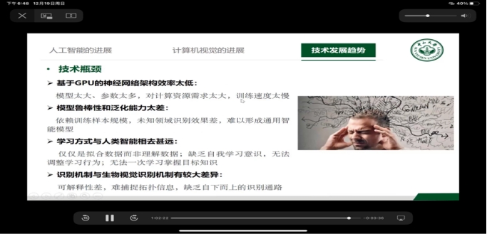 首先,赖剑煌教授为同学们介绍了人工智能与计算机视觉技术的发展趋势,包括:人工智能的进展、计算机视觉的进展和技术发展趋势等三大板块的内容,让同学们见识到了将人工智能引入计算机视觉,给计算机视觉带来了全新的活力和发展的动力,明白了深度学习人工智能可以强国,人工智能需要依赖数据和算法跟场景结合去实现。