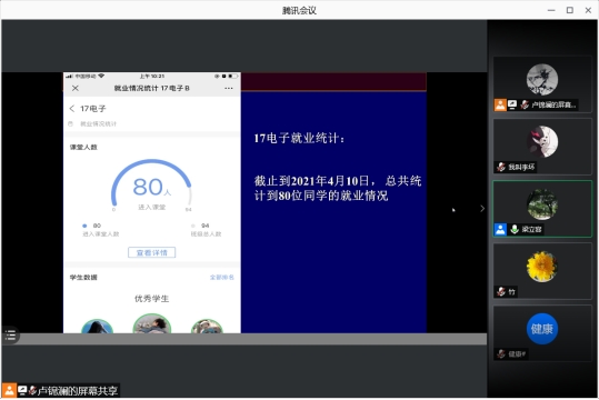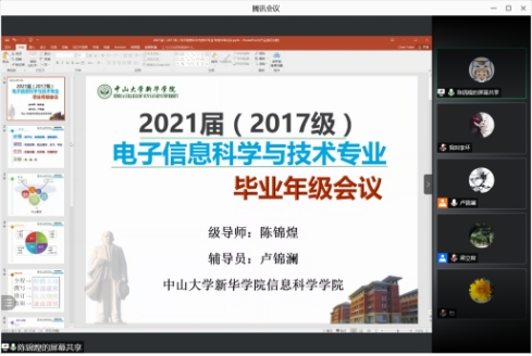 2021届高校毕业生总规模约为909万人,首次突破900万大关,今年的政府工作报告也指出“做好高校毕业生、退役军人、农民工等重点群体就业工作。”然而,受新型冠肺炎疫情和其他因素的影响,今年高校的就业形式相对较为严峻。因此,为了更好地帮助同学们就业,掌握更多的就业信息,提高学生们的就业能力,2021年4月11日(周日)晚上19:00通过腾讯会议APP准时召开了线上的家长会,这次家长会是针对2017级电子信息科学与技术专业(以下简称为“17电子”)家长和学生召开的。出席本次家长会的成员有:17电子专业主任魏爱香老师、17电子专业主任梁立容老师、17电子辅导员卢锦澜老师、17电子班主任陈锦煌老师、17电子的家长和学生们、共计90余人。