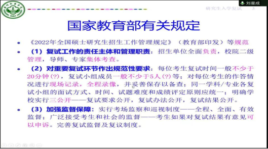 会议伊始,刘星成教授为我们介绍了教育部的有关规定——《2022年全国硕士研究生招生工作管理规定》如:复试工作的责任主体和管理职责、对重要复试环节作出规范性要求、加强监督保障等。