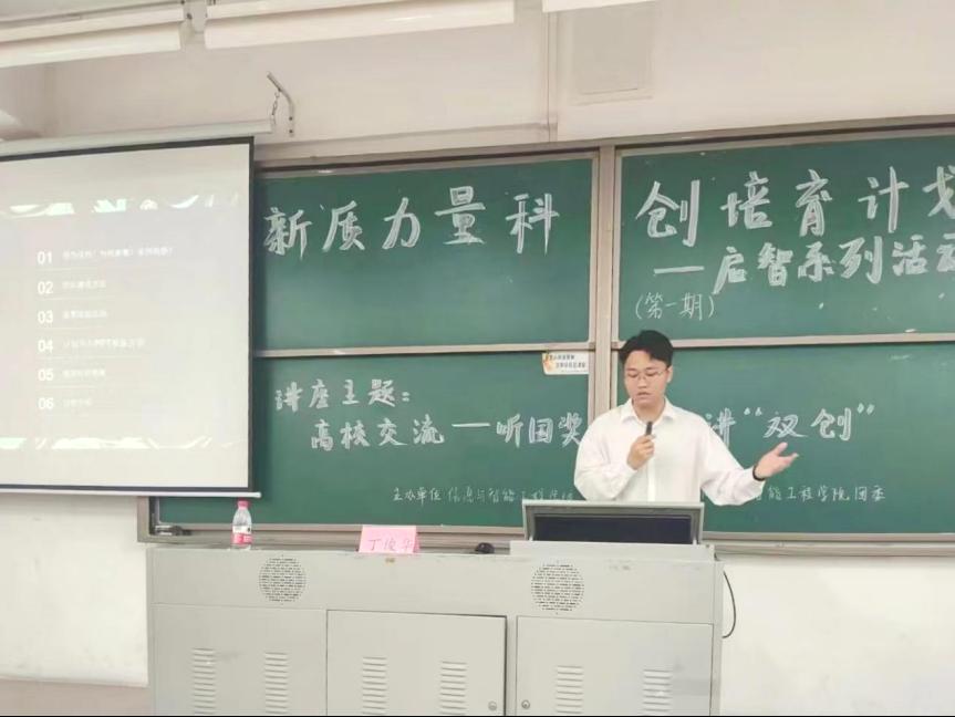 东莞理工学院锂工正极团队代表周全同学简单的介绍了目前他们团队的公司现状,同时也分享了自己的大学参赛收获,激励同学们充分把握大学机遇,发挥创新精神,勇担当代青年使命。