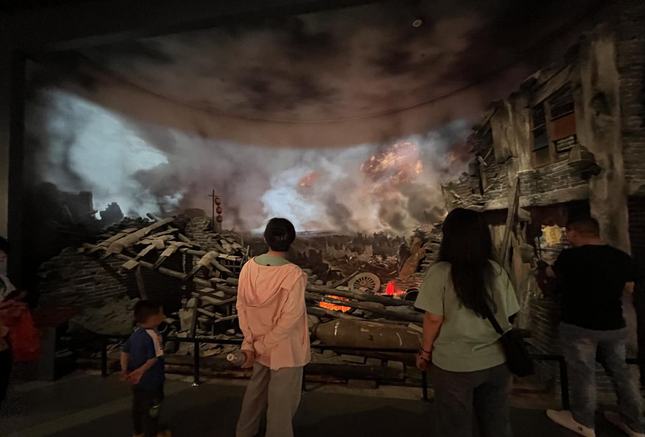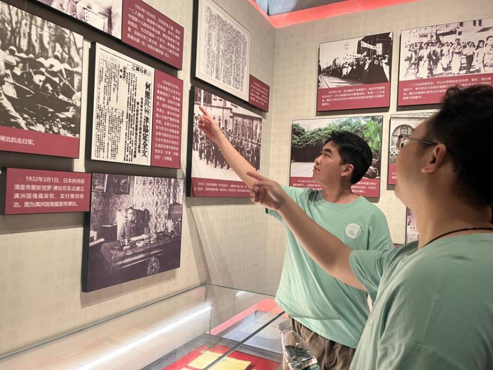 辅导员朱特林(左)和辅导员李晓霞(右)观看抗战模拟场景