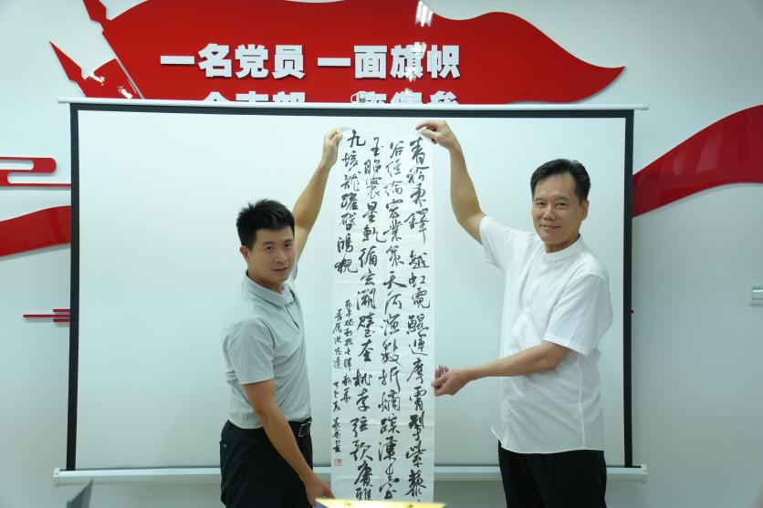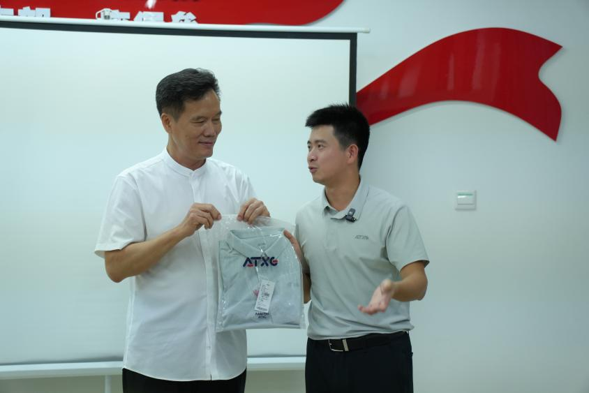 紧接着张平楠主任将自己写的书法作品赠送给校友,学生代表赠送学院文创礼品给校友,表达对校友浓浓的情谊,更寄托着我们对未来的美好期许。校友洪志达也将自己公司采用前沿科技面料匠心打造的服装赠送给学校,表达对母校的感谢与热爱。