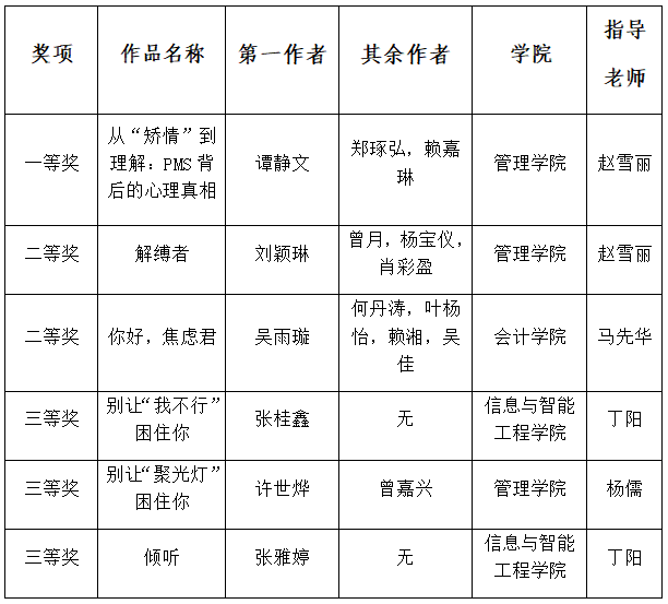 本次比赛共吸引了来自管理学院、会计学院、艺术设计与传媒学院等全校多个学院的队伍踊跃参赛。各参赛队伍凭借独特的视角和富有创意的表达,通过作品展现了他们对心理知识的深入理解和思考。作品主题丰富多样,从多维度的视角出发,聚焦到了大学生日常生活中常见的心理困境,如社交压力与学习焦虑等,也有的队伍关注到了女性生活中面临的特殊挑战,如 PMS 经前综合征等,每份作品都为心理健康话题注入了多元而细腻的内涵。参赛视频均以3-5分钟短小篇幅,将专业心理知识转化为通俗叙事向大家娓娓道来。