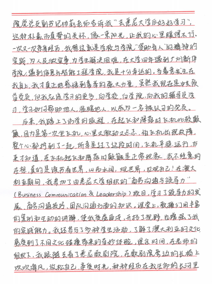 归国后,杨成伟同学心怀感恩,亲笔撰写感谢信。信中真挚地表达了对学校及学院悉心培育、慷慨资助的感激之情,回顾留学路上学院始终是他坚实的后盾,让他能无后顾之忧逐梦远方。这份感恩也化作他前行的动力,誓言要把留学所得回馈学院、惠及同学,带动身边人一同奋进。