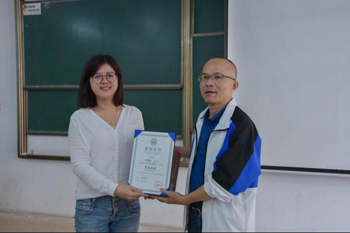 图4:信息科学学院党总支副书记林少淇为伍雄灿先生颁发荣誉聘书