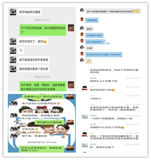 由于学生因家庭原因确实无法租借到电脑,只能将学校台式电脑或笔记本电脑寄回家,为打包和寄送增加了难度,又由于疫情防控特殊时期,校外人员和车辆不允许进入校园,辅导员老师们就利用办公室推车、私家车进行搬运,将学生的电脑送到校门口快递员处,并叮嘱物件的重要性,告知学生该保价的进行保价,确保电脑安全送到学生手中。个性化帮扶的每一个细节、每一次举动都体现了辅导员们的用心和暖心。“老师,看到快递发出通知啦,谢谢。”“老师,辛苦啦,爱你哟”一声声真诚的感谢,让辅导员们觉得非常欣慰。