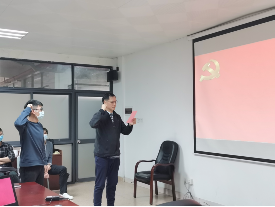 本次会议的第三个议题是教工党支部讨论发展对象邹嘉俊同志转预备党员事项。会议由支部书记何忠礼主持。首先,邹嘉俊同志向大会宣读入党志愿书,分别从思想、工作、学习及生活等方面汇报了个人在培养期间的表现,做到了严格用党员标准要求自己。接着,组织委员陈诗源老师对发展对象进行政审状况介绍。随后,入党介绍人丁阳、黄雪敏老师分别介绍了邹嘉俊同志在培养期间的综合表现情况,认为其基本具备了党员条件,并同意其转为预备党员。经与会教师党员同志充分讨论后,全体教师党员(不含预备期党员)进行无记名投票表决,全票通过邹嘉俊同志按期转为预备党员,并由何忠礼书记带领其进行新党员入党宣誓。