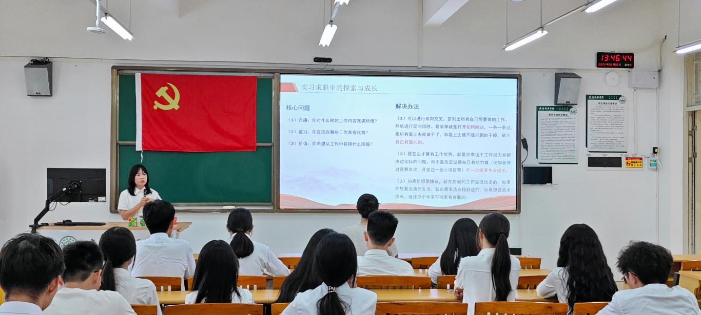 活动伊始,由主持人赵君璞同志分别邀请优秀毕业生党员叶俊美同志、杨成伟通知进行经验分享。叶俊美同志分享了她在实习求职中的探索与成长经历。她以自身为例,详细阐述了如何通过双向交叉筛选工作机会、如何明确自身工作优势以及如何根据自身价值观选择合适的工作。她还提醒同学们在求职过程中注意甄别招聘软件上的信息,推荐了企业官网招聘渠道、学校校园招聘会以及全国大学生就业服务平台等较为靠谱的工作来源。此外,她还向大家普及了社保和住房公积金的相关知识,解答了同学们在实习试用期社保缴纳、灵活就业社保补贴以及自愿放弃社保等问题上的疑惑,为即将步入职场的同学们提供了实用的指导。