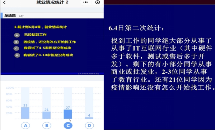 软件工程专业2020届毕业生就业率达到92.54%,整体就业形势良好。软件工程专业主任赵小蕾从就业情况,总结反思就业指导工作。据统计,大部分软工的优秀毕业生能够到大企业就业,主要的就业岗位为软件开发、软件测试、产品或游戏策划的开发及运维等,学生的专业对口率较高。赵小蕾老师分别从专业的培养定位、课程设置、培养方向逐步收敛、各个环节细致落实、注重成果产出等方面分享了专业的就业部署工作,为其他专业分享经验方法。