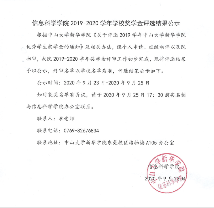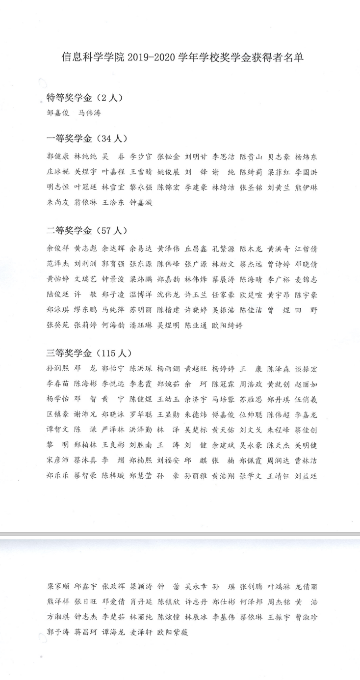 【公示】信息科学学院2019-2020学年学校奖学金获得者名单