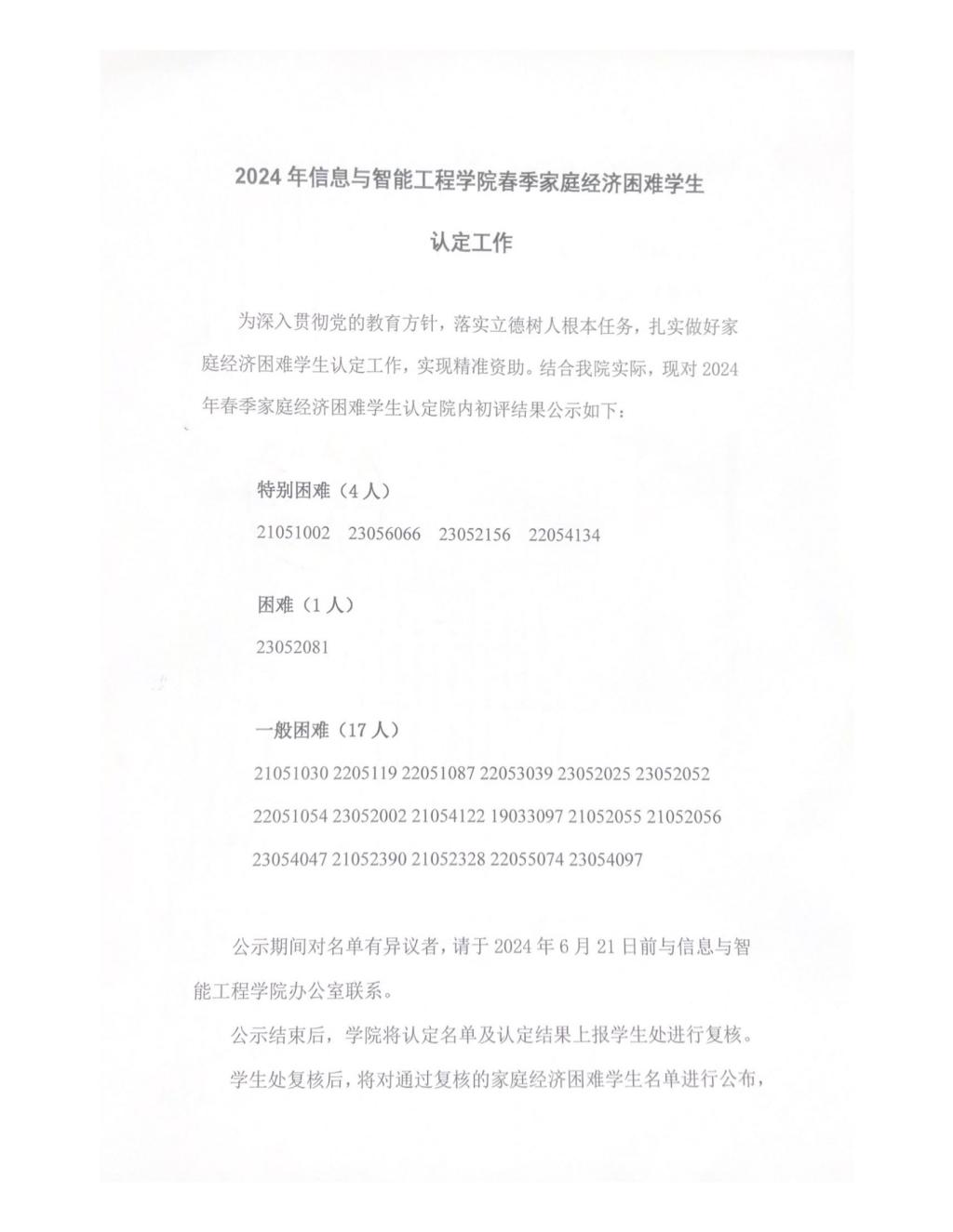 【公示】2024 年永利yl23411,永利yl23411春季家庭经济困难学生认定工作
