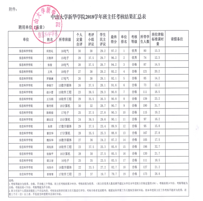 根据《中山大学新华学院班主任工作实施办法》文件精神和管理规定,通过班主任自评、学生评议、学院考评三个环节,对永利yl234112018学年全体班主任进行考核,现将考核结果公示如下: