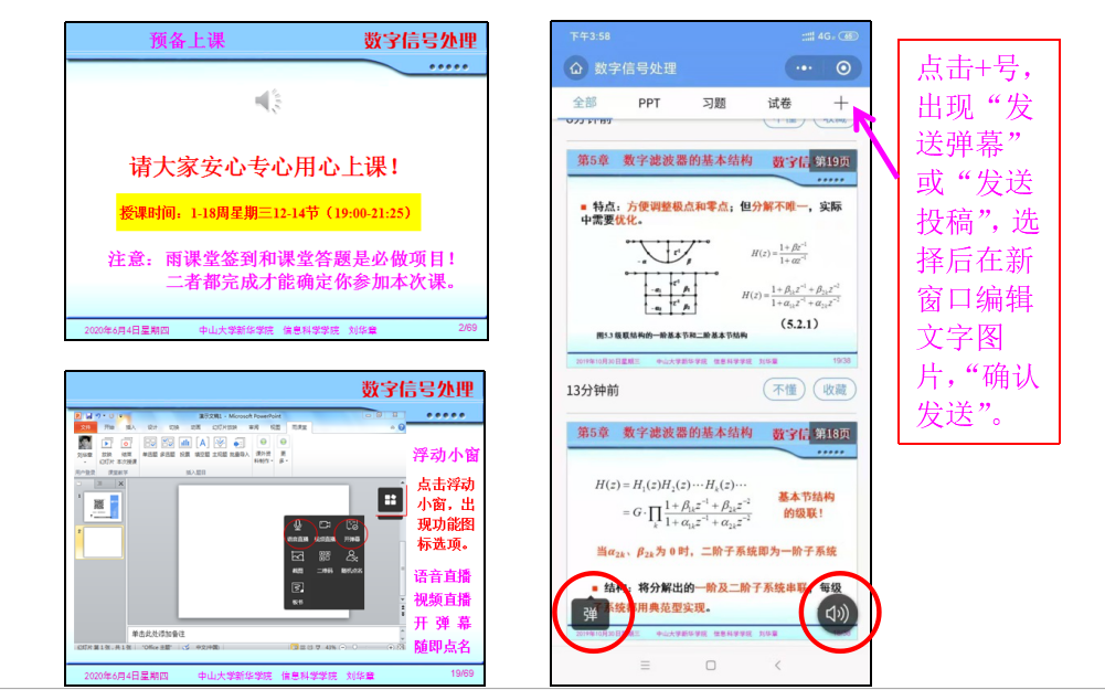 刘华章老师在开课前10分钟进行开课准备,检查上课设备,开启授课平台,让学生提早签到进入课堂。首次直播要告知进入直播课堂准确操作方法,推送资料内容方式,网上签到方式,调查学生意向(含上网方式、直播时长、课堂笔记、答题类型、答题数量、课外学习平台、课外学习时间、预习方式、预习素材等等)。学生反馈问题最多的是网络卡顿,时延严重,老师讲的PPT内容过一段时间才收到,为此,刘华章老师首先从自身找原因,解决自身问题,即以学生身份另增加一台笔记本和手机进入课堂,监测网络时延问题,当监听监看PPT正常了,再继续进行网上直播,有效解决了时延问题。
