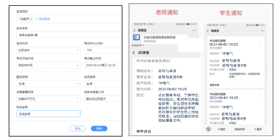雨课堂标准版考试模式:通过免费下载的雨课堂标准版,采用题目乱序和选项乱序功能进行考试,PC和手机均支持;