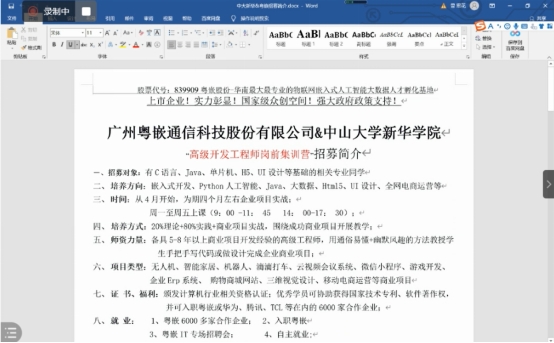 为了让学生能够进一步了解招聘中的相关内容及明确就业方向,4月1日19时-21时,由卢锦澜老师主持召开了广州粤嵌通信科技股份有限公司(以下简称“粤嵌”)线上招聘宣讲会,此次会议,邀请了粤嵌集团就业中心副部长曾宏花老师为大家讲解就业相关内容。