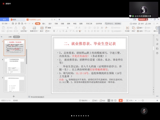 谷长乐老师对学校疫情防控要求、学生就业信息的填报,学生考研、考公、基础就业、大学生入伍、就业上报上报、后期安排等多方面进行展开说明。进一步明确了本学期的工作内容。