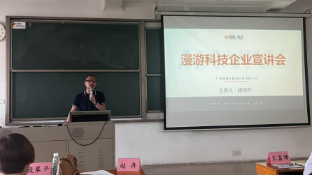 广州漫游计算机科技有限公司校企合作经理杨旭升介绍了校企合作的内容,从人才输出、实习配套设施、就业岗位到对标往届优秀师兄师姐的实训成果等进行介绍,鼓励同学们积极参加实训,提升专业能力。