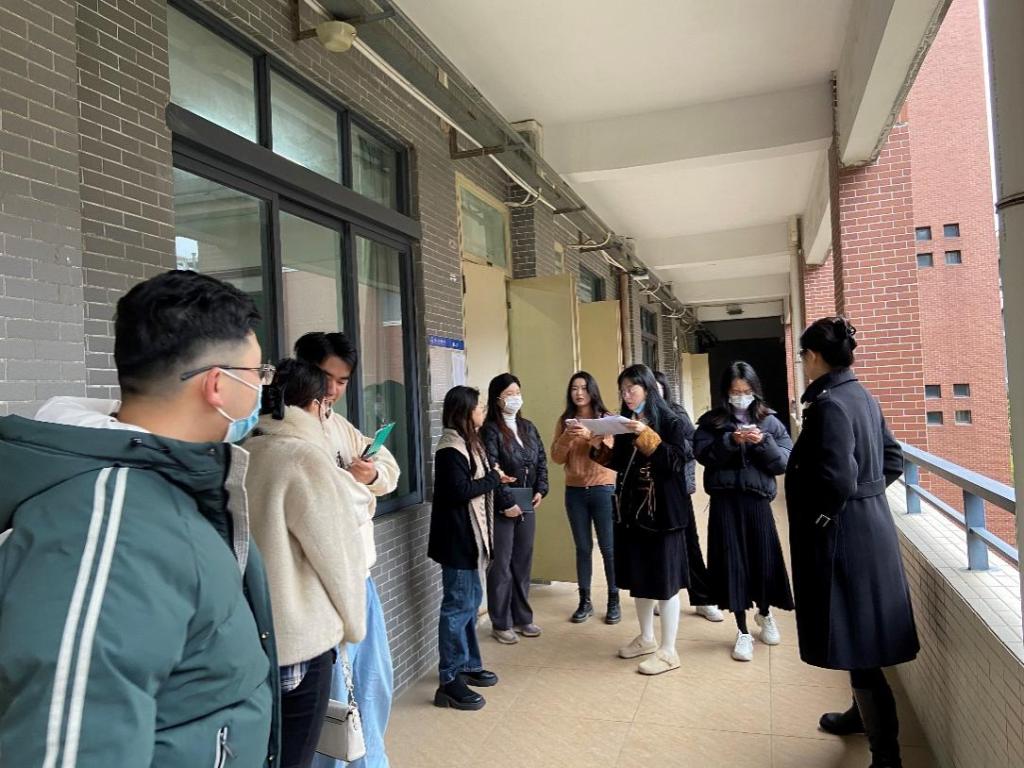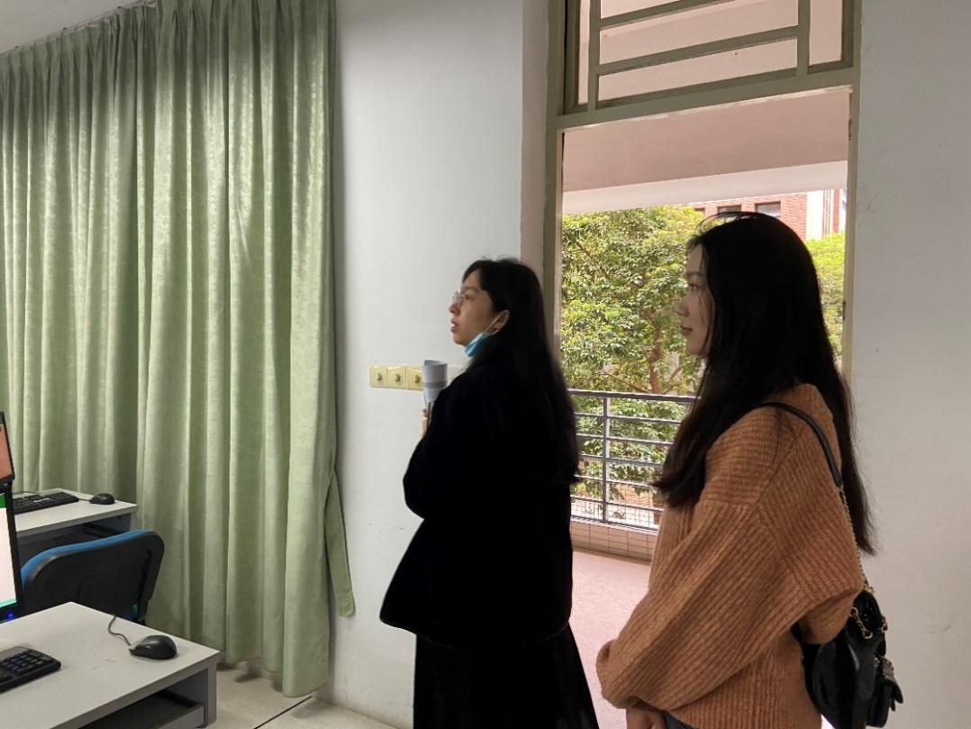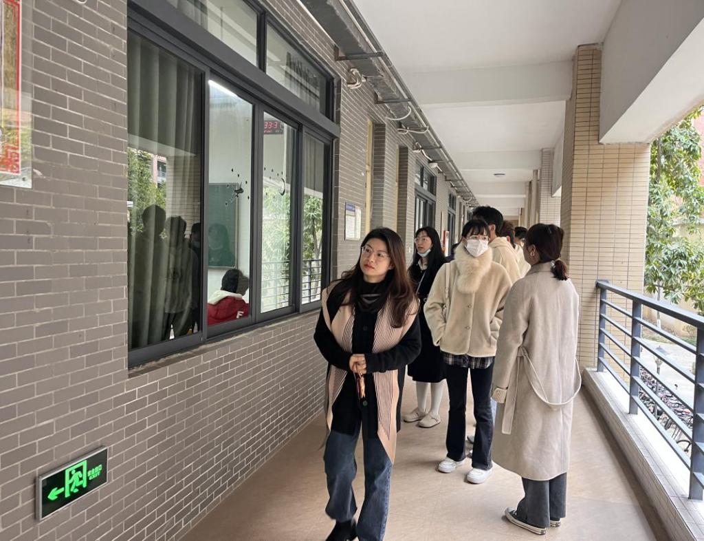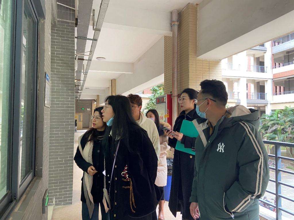 党总支副书记帅莉与学工团队在教室外观察同学们的上课情况